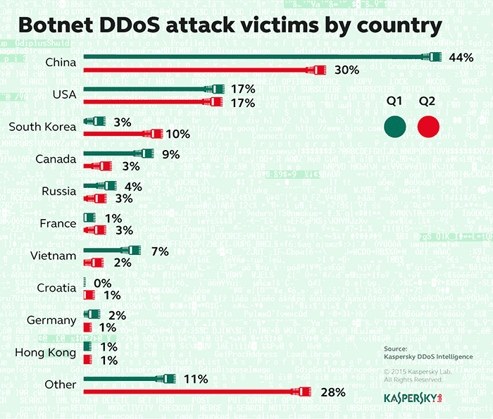 According to the Kaspersky DDoS Intelligence statistics for Q2 of 2015, three-quarters of resources attacked via botnets are located in just 10 countries. The undisputed leadership of the United States and China is explained by the cheap hosting in these countries. However, the changes in the other positions of the ranking and the growing number of countries affected by this type of attack prove that no territory is secured against DDoS.