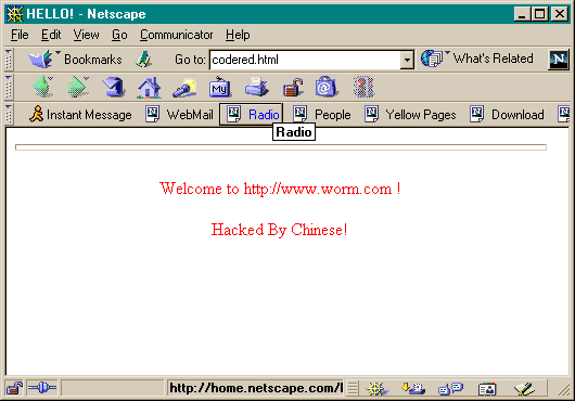 After having shown the bogus, hacked Web-site page within 10 hours, the worm automatically returns everything to norm so that a user only views the original site contents. It is important to note that this only occurs on sites where a "US English" codepage is set as default.