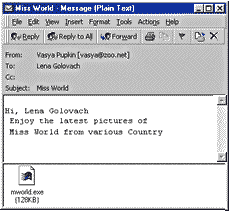 "MsWorld" is a Windows-application about 130Kb size written in Visual Basic programming language with embedded Macromedia Flash modules. The worm spreads in attached files via e-mail by using the widely-used MS Outlook e-mail program. The infected messages look as follows: