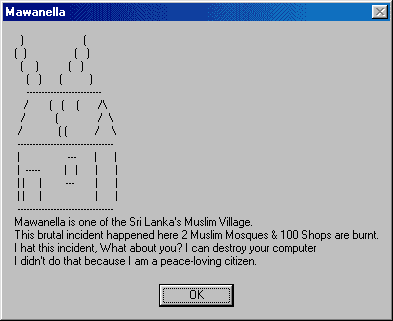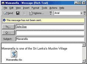 Kaspersky Lab, an international data-security software-development company, warns users about the detection of the latest Internet worm, "Mawanella", that was created by someone utilizing the virus writing kit VBS Worm Generator, which is better known as having been used to spawn the "Kournikova" virus epidemic at the beginning of this year. Our technical support department has received several reports of this worm being detected "in the wild."