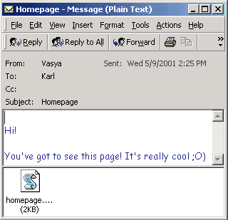 "Homepage" is written in Visual Basic Script (VBS) and is able to operate on the Windows Scripting Host (in Windows 98 Windows 2000, installed by default); otherwise, the file-carrying worm simply cannot be launched.