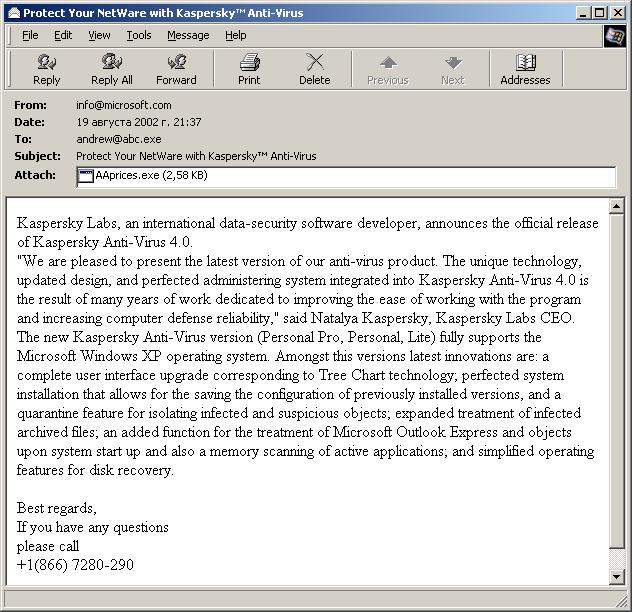 Kaspersky Lab warns computer users of a massive mailing of the Trojan-style malicious program, TrojanDownloader.Win32.Apher. Presently there have already been several registered reports of infection. The Trojan is sent out by an anonymous evildoer using an anonymous e-mail address from a public access e-mail service. The messages themselves have a spoofed address showing the sender as info@microsoft.com. The infected message has the following attributes: