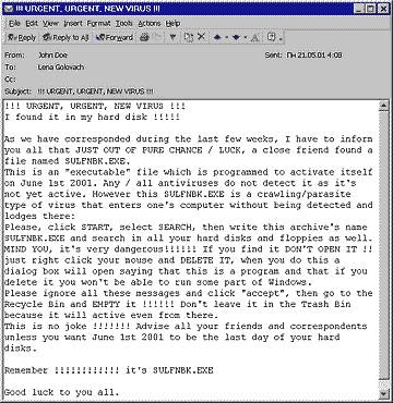 Warnings about the pseudo-virus began spreading two weeks ago, causing a real scare amongst users. As indicated in the message's text concerning the "virus," it contains a SULFNBK.EXE file that is programmed to activate the destructive payload on June 1. As is typical when a virus hoax is making the rounds, it is reported that not one anti-virus program is able to detect this "virus"; therefore, the only means of ridding a computer of this threat is to erase the SULFNBK.EXE virus-carrying file.