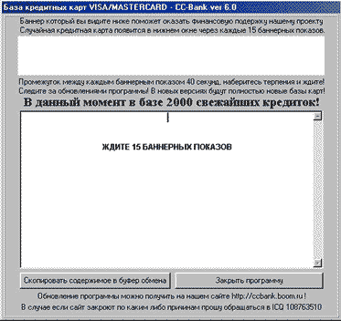 Eurosol masterfully cloaks itself under the CC-Bank program, ostensibly allowing for the receiving of money by viewing an advertising module: a user views 15 banners after which CC-Bank, supposedly, provides the number for an actual credit card with a definite account sum; using this information, it is possible to make purchases.