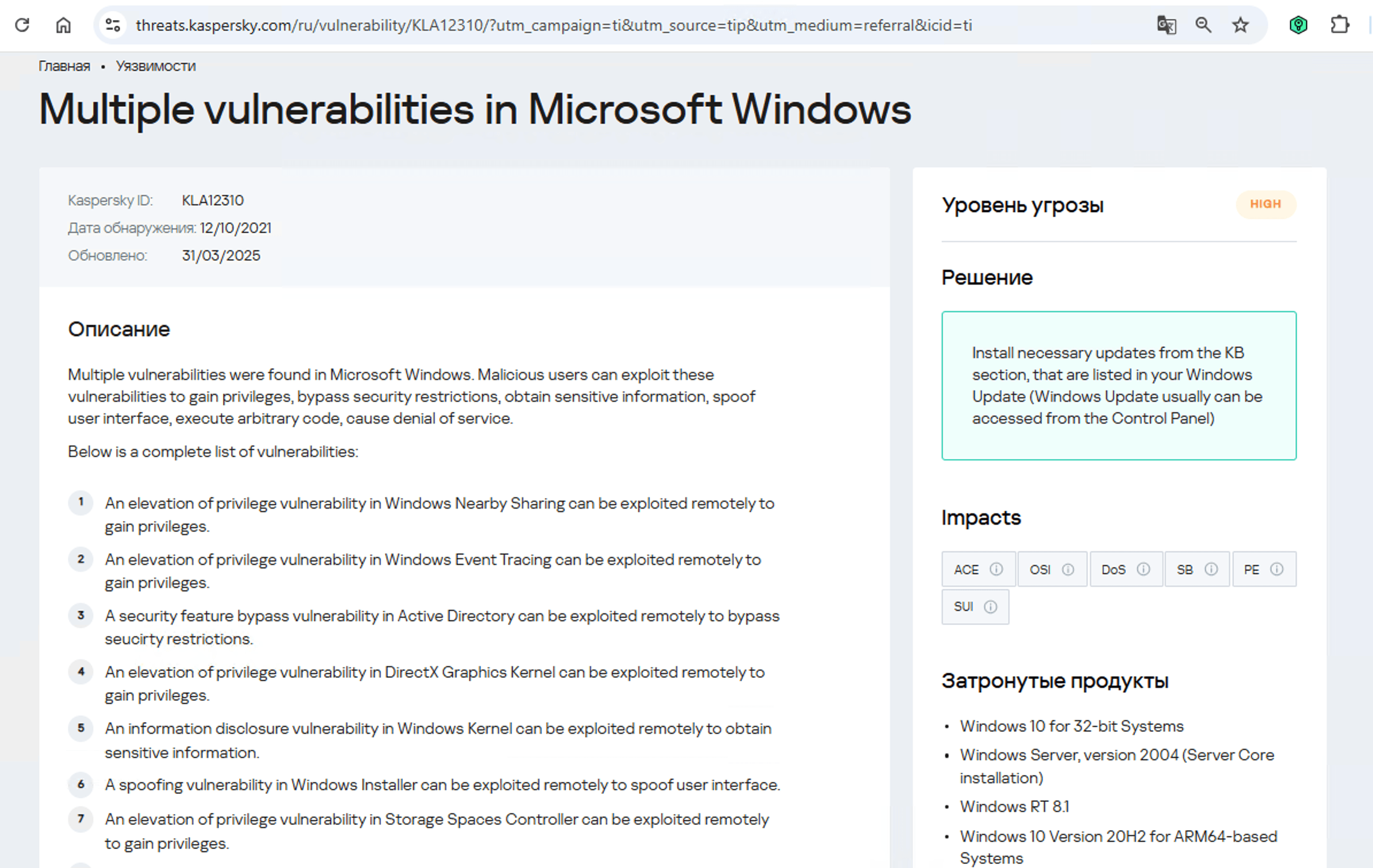 Como podemos ver, es una vulnerabilidad de escalada de privilegios, lo que significa que se usa después de que los ciberdelincuentes ya se han infiltrado en la infraestructura. Esta vulnerabilidad tiene una clasificación de gravedad alta y se explota mucho en entornos reales. Entonces, ¿qué software es realmente vulnerable?