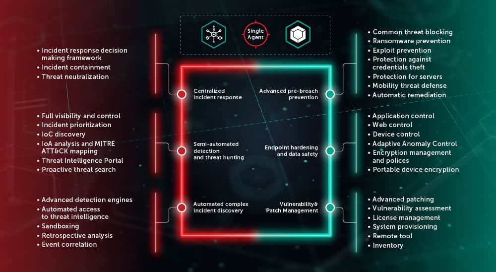 Contar con un único agente para la prevención, investigación, búsqueda y respuesta reduce el coste total de propiedad, simplifica la gestión de incidentes y minimiza los costes de mantenimiento. Kaspersky EDR es un módulo rápido y fácil de implementar para la detección, investigación y respuesta ante incidentes complejos, que se puede activar en nuestro producto líder a nivel mundial Kaspersky Endpoint Security for Business.