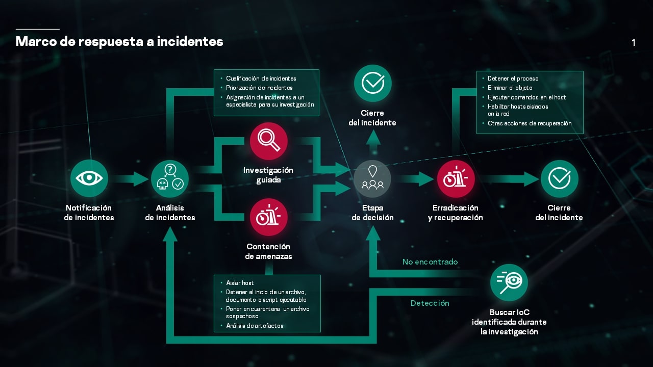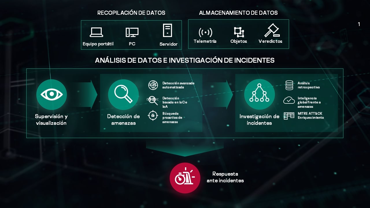 Kaspersky EDR reduce el tiempo necesario para la recopilación de pruebas inicial, mejora los análisis de telemetría en el nivel del endpoint y automatiza los procesos de detección y respuesta de endpoints, acortando los tiempos de respuesta generales de horas a minutos. Con una sola interfaz web, permite la investigación en tiempo real y ofrece un panorama general de las actividades de la base de datos históricos, incluso para los endpoints que no están en la red o cuando los datos se han cifrado debido a un ataque.