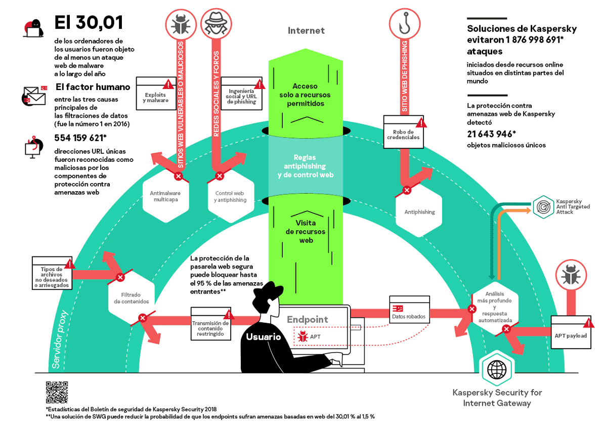 - Kaspersky Security for Internet Gateway ofrece protección ante una amplia variedad de situaciones de ataques basados en web, como descargas de malware, ataques ocultos o ataques de "abrevadero" que aprovechan a exploits, sitio web de phishing que imitan recursos legítimos y muchos más. También reduce el riesgo de infección y fugas de datos al limitar el acceso a determinados recursos web y categorías, así como al restringir la transmisión de determinados tipos de archivos.