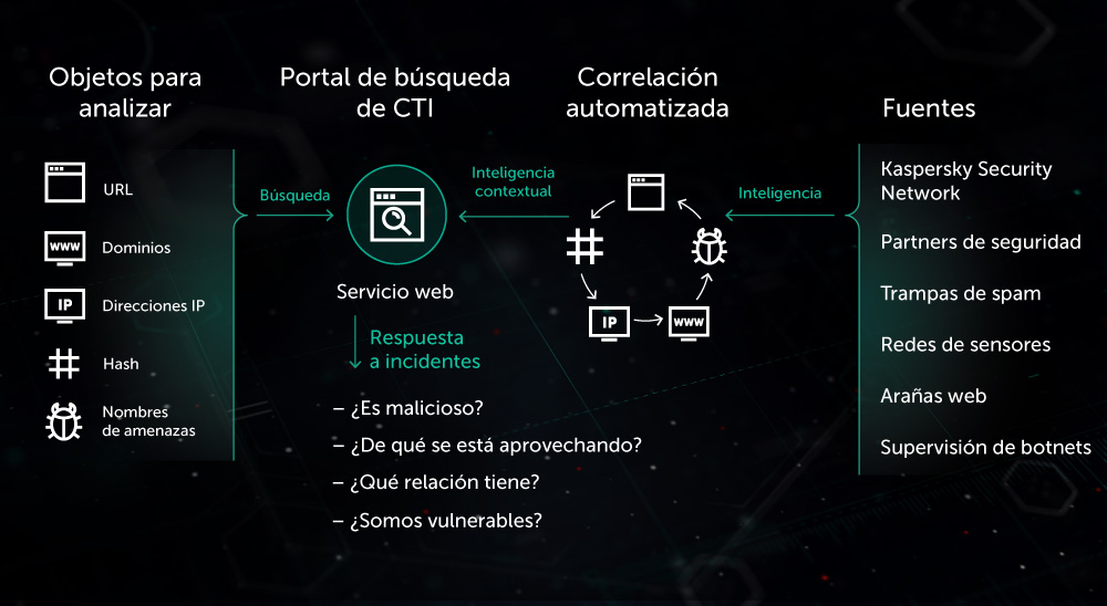 Permite la búsqueda en tiempo real de varios petabytes de datos sobre amenazas recopilados, categorizados y analizados por Kaspersky Lab a lo largo de nuestra historia, proporcionando así visibilidad global de las amenazas y sus interconexiones