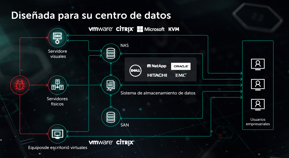 La protección sin agentes y de agentes ligeros para servidores virtualizados y equipos de escritorio, organizada centralmente, solo es una parte de nuestra oferta de seguridad para centros de datos de transporte basados en la nube.